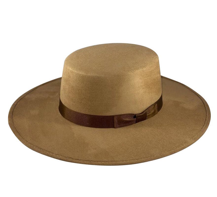 The Olga Cordobés is a standout piece crafted from stiff suede, featuring a wide 3½" brim and a classic flat crown, embodying the elegance of a timeless "Boater" hat. With a brown ribbon inner band and a removable fabric band (sold separately), this camel-colored hat offers versatility for any season. Manufactured in Guanajuato, Mexico, the Olga Cordobés is a staple for any wardrobe, adding sophistication and style to any look.